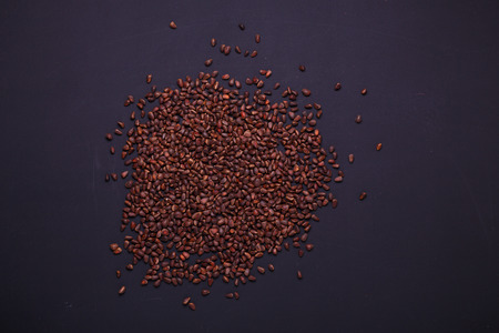 Brown coffee beans texture on black background for design. Saint Valentine's Day card on fabruary 14, holiday concept