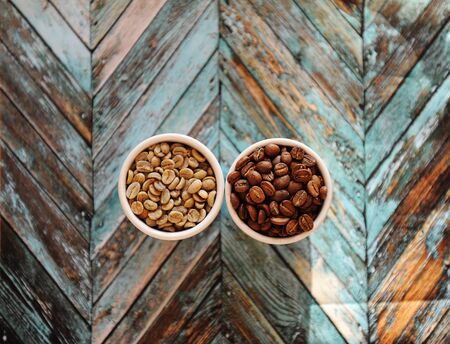 Specialty coffee concept. Green raw coffee beans and roasted coffee beans in three white cups on turquoise wooden parquet background top view