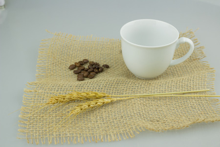 Coffeecup with coffeebeans on gunny textile isolate background.