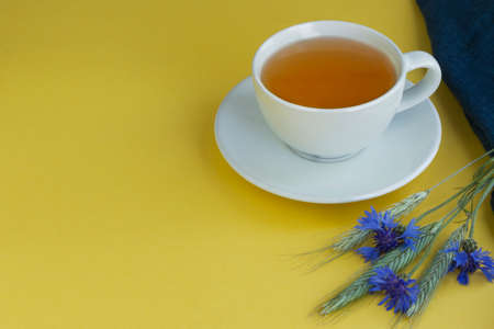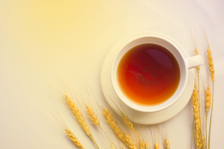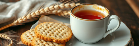 Delicious tea with cookies served on a wooden table with wheat stalks in the background during the afternoon