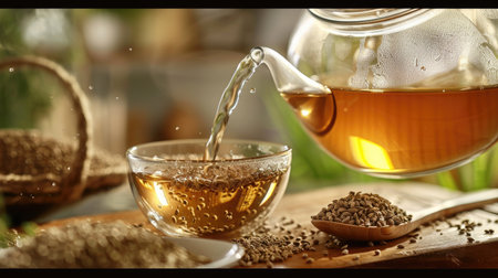 Herbal cumin tea served in elegant glassware, with a wooden spoon filled with aromatic cumin seeds adding a touch of rustic charm.