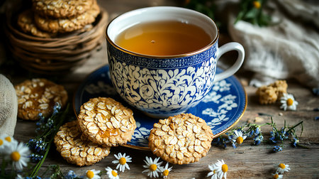 Generative AI Image of a Cup of Chamomile Tea with Oatmeal Biscuit on Wooden Table