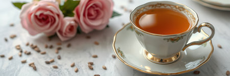 Delicate tea cup with pink roses on a marble table creates an inviting atmosphere for a relaxing afternoon