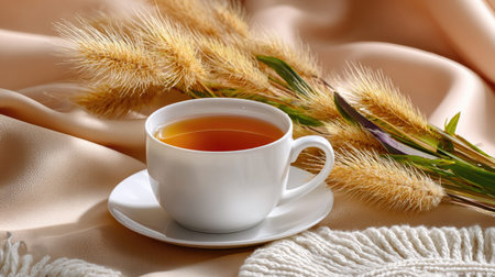 A serene composition featuring a cup of warm tea beside soft textiles and delicate grains, creating a tranquil atmosphere perfect for relaxation and mindfulness.