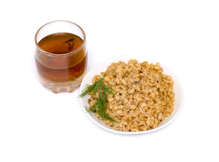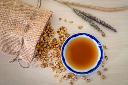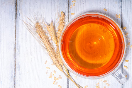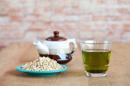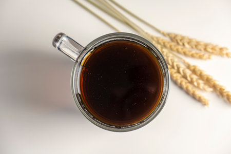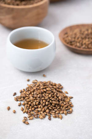Organic barley tea cup , alternative trendy orzo tea in glass mug