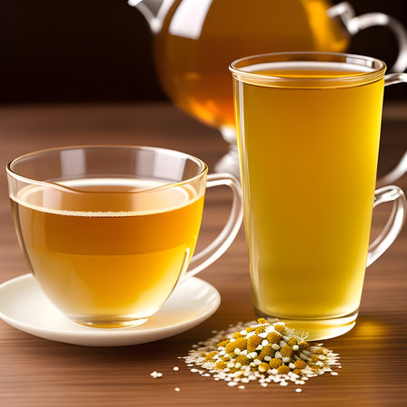 This serene image captures the essence of tea brewing, featuring a cup of tea, sesame seeds, and fresh greenery, perfect for creating a calming atmosphere.