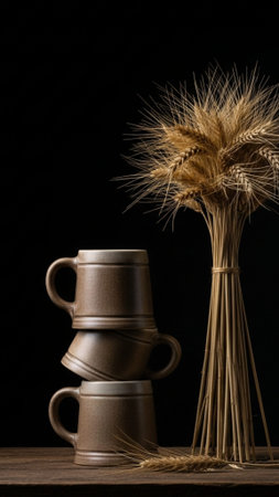A vertical, tall 9:16 still life photograph. Three heavy, matte beige, unglazed ceramic pint tankard