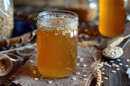 Artisanal Honey Jar Drizzled with Oats on Rustic Wooden Background for Gourmet Experience AI