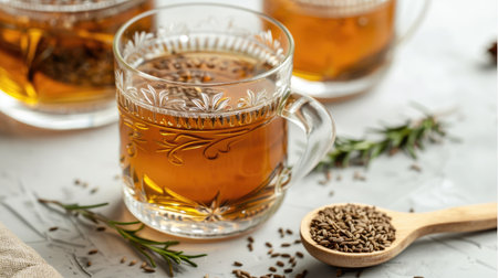 Herbal cumin tea served in elegant glassware, with a wooden spoon filled with aromatic cumin seeds adding a touch of rustic charm.