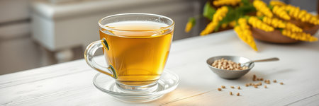 Herbal tea served in a clear glass cup beside a silver spoon with seeds and yellow flowers in the background