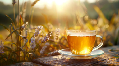A beautiful glass cup filled with tea sits gracefully on soft fabric, showcasing intricate floral designs that enhance the warm ambiance of the scene.