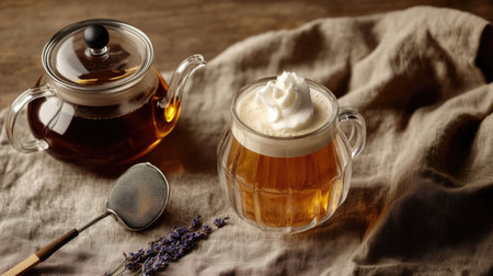 Teapot and teacup with Earl Grey tea: Herbal tea, tea strainer, honey, calming drink, linen cloth, warm beverage