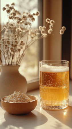 A glass of probiotic kefir drink with bubbles, placed near a bowl of kefir grains on a window with warm sunlight. A gut-friendly, fermented beverage.