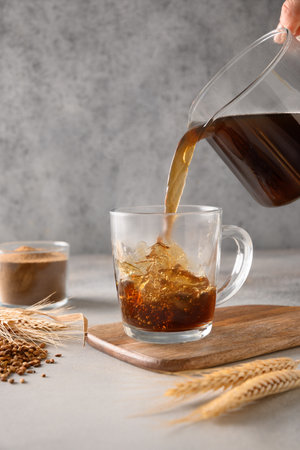 Pouring barley coffee in glass cup on gray background. Cooking healthy caffeine free alternative coffee. Close up. Vertical format.