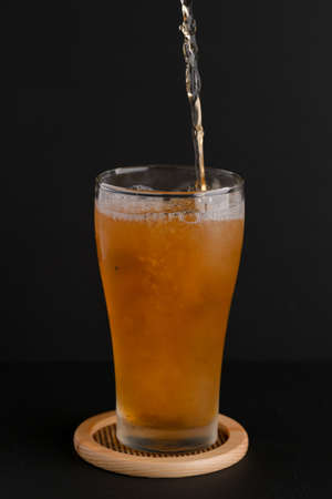 Glass of iced tea with ice cubes and sunlit shaded background. That the image is generated using AI.