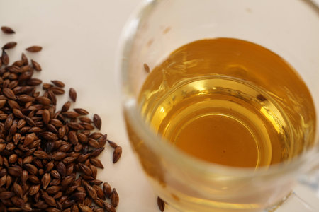 Dry barley grain brown malt ingredient in cooking and beverage production. Process of making craft beer from malt. Concept of alcoholic beverage homemade.