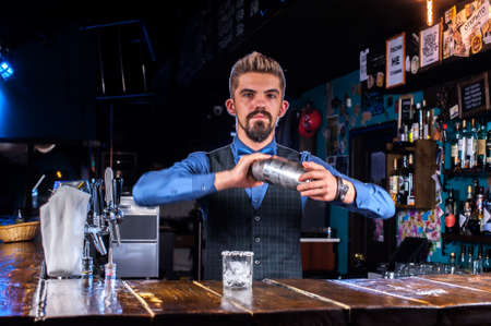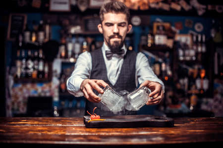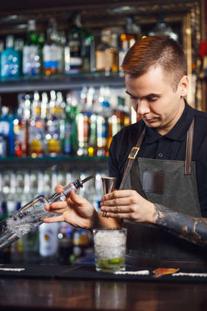 young handsome bartender pours cocktail in shaker. Two glasses with ice stand on bar.