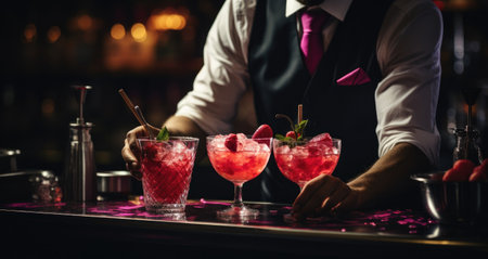 a bartender pouring a cocktail and cocktail sundae at bar barman holding cocktail with strawberry.