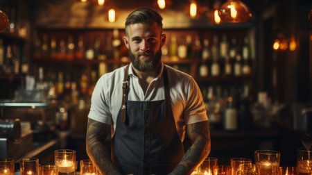 A confident, tattooed male bartender stands proudly behind a bar illuminated by candlelight, showcasing a cozy and inviting atmosphere in a rustic setting.