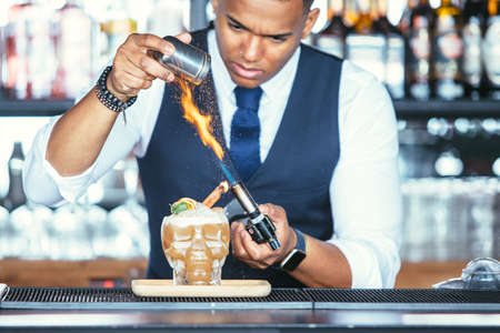 Cropped view of the detail of the hands of a mixed race male expert bartender is using cinnamon powder and a blowtorch for decorating a cocktail at the bar counter