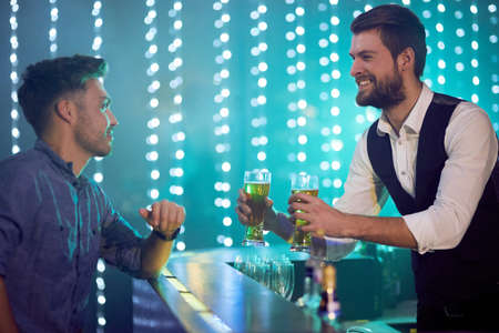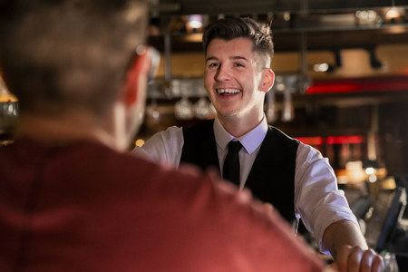 Cheerful young barman smiling and talking to client in bar