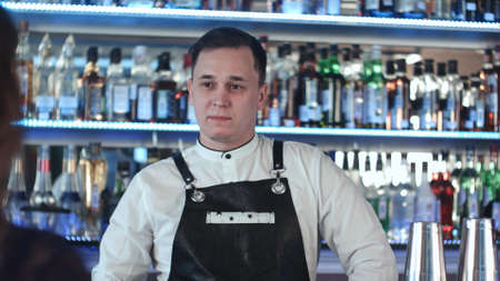 Barman in a brown leather apron making fruit alcoholic cocktail standing behind the bar counter