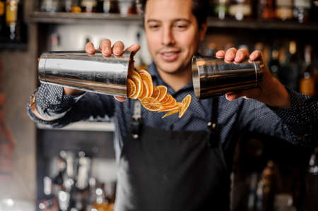 Young smiling barman pouring thin slices of fresh orange fruit from his shakers on the background of bar counter