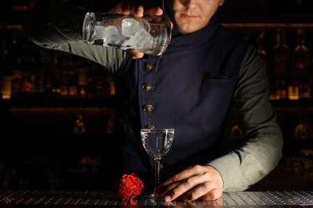 Bartender pouring alcoholic drink into the elegant cocktail glass near the red rosebud on the bar counter
