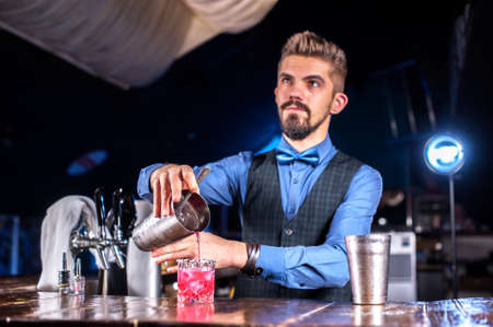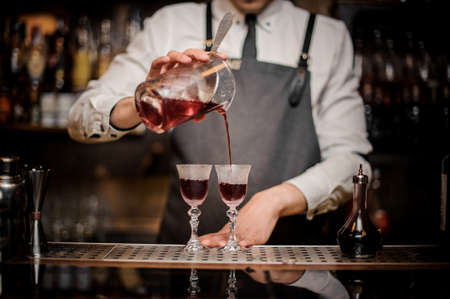 Barman pouring strong and elegant summer Arnaud cocktail into the glasses on the bar counter