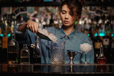 Female bartender adding to the measuring glass cup an ice cubes
