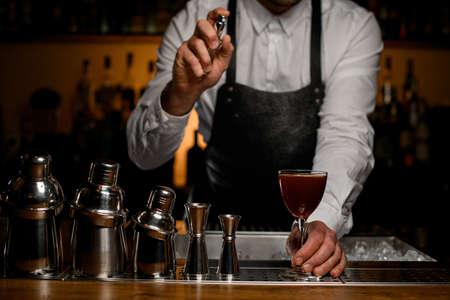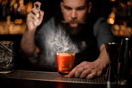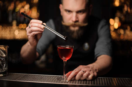Close-up. Man at bar accurate sprinkles on glass with cocktail and make fire.