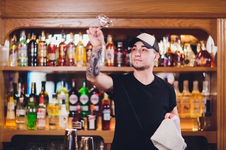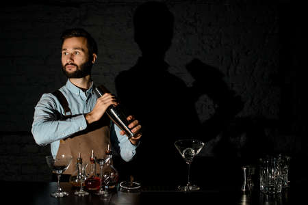 Young handsome bartender standing behind the bar counter with glassy shaker.