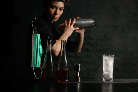 Professional bartender holding a steel shaker on the bar counter with the bar equipment