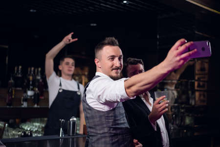 mens friends take selfies in the background of the bar, smiling.
