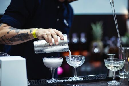 Kyiv, Ukraine, September 28, 2018. A tattooed bartender pours liquor from a shaker into a champagne glass coupe de champagne on Barometer international bar show.
