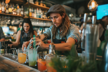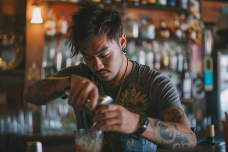 A man skillfully prepares a drink at the bar, showcasing his expertise and precision, A hipster bartender mixing cocktails at a retro bar, AI Generated