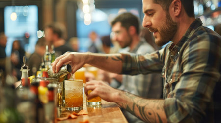 A man, a bartender, skillfully prepares a drink behind the bar counter.