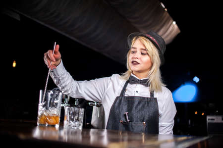 Bartender making a cocktail stirring it in a glass with ice cubes on the bar counter