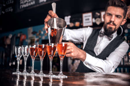 Bearded bartender pouring fresh alcoholic drink into the glasses at bar