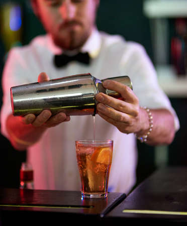 Bartender pouring fresh cocktail in fancy glass with ice