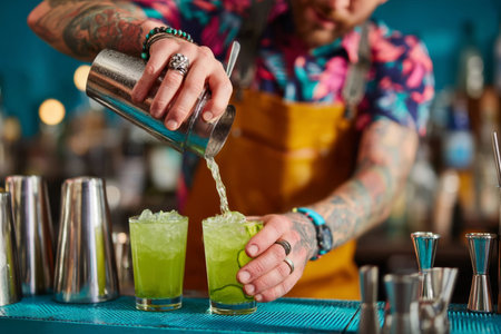 Tattooed bartender pours green cocktail into two glasses filled with cucumber and ice. Scene emphasizes colorful tattoos, cocktail tools, and bar counter in a vibrant close-up setting focused on drink preparation.