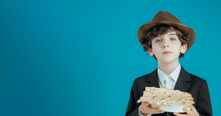 Jewish orthodox boy holding a plate of matzah for Passover on a blue background, banner