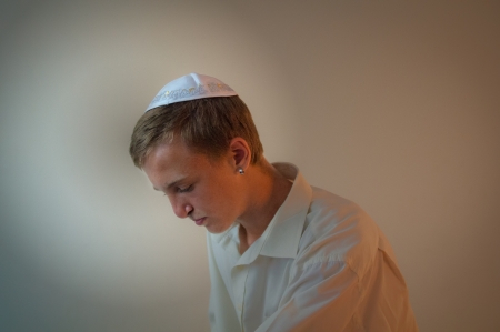 Young Jewish man does prayers .