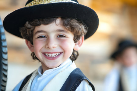 Joyful young Jewish boy in cultural attire smiling warmly outside on a sunny day, celebrating heritage and identity.