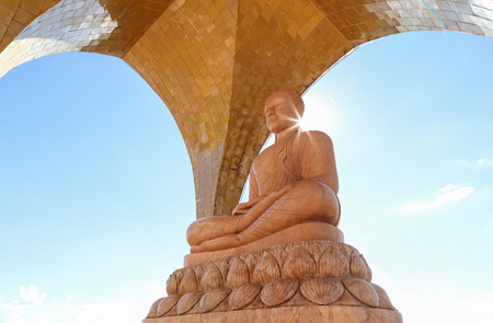 Phetchabun, Thailand - November 23, 2015: Orange marble buddha statue in meditation pose with sun star and blue sky in behind under mosaic tiles building.