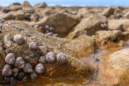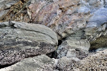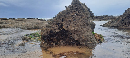 Rocks at beach covered with mussels, barnacles and limpet shells on a cloudy overcast day.