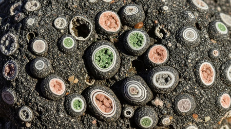 A close-up of a dark rock surface covered in numerous small geode-like mineral formations with colorful...