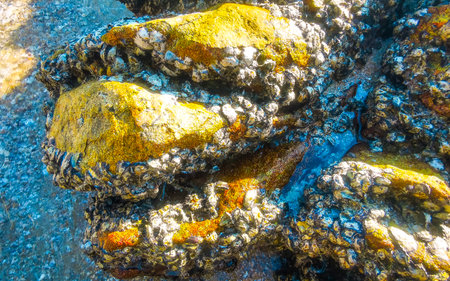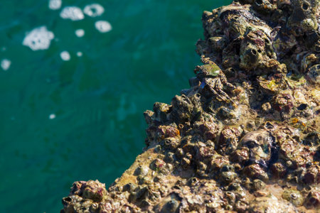 Shells mussels on rock rocks boulders at coastal sea beach in turquoise green blue water.