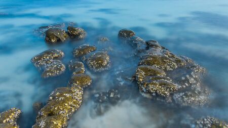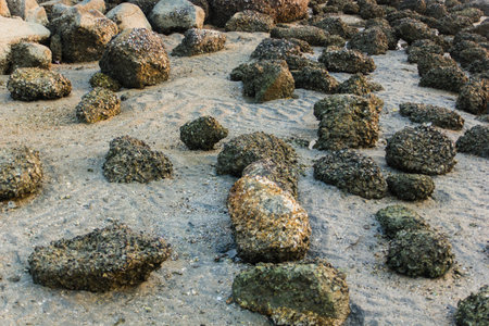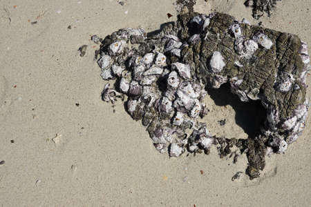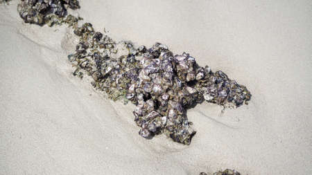 Beach with oyster shells on the rock, Top view, space for your text, Too soft