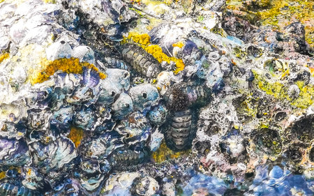 Shells mussels on rock rocks boulders at coastal sea beach in turquoise green blue water in Patong Beach Kathu District Phuket Island Province Southern Thailand in Southeast Asia.